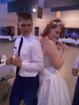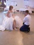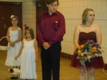 It has been a crazy, awesome, wonderful weekend. The bride was gorgeous, the groom was handsome and the wedding was beautiful. I had three cameras – my really good pink camera, my inexpensive purple camera and my phone. I checked the battery before I left and they were all full. I took about fifteen pictures with my pink camera and then it died – before the ceremony even began. My purple camera, which takes really good shots when it feels like taking good shots, lasted longer before the battery was exhausted, not quite making it through the reception. And then my phone finished up the job, luckily having enough battery life to see the kids off. Luckily I got most of the important shots. 🙂