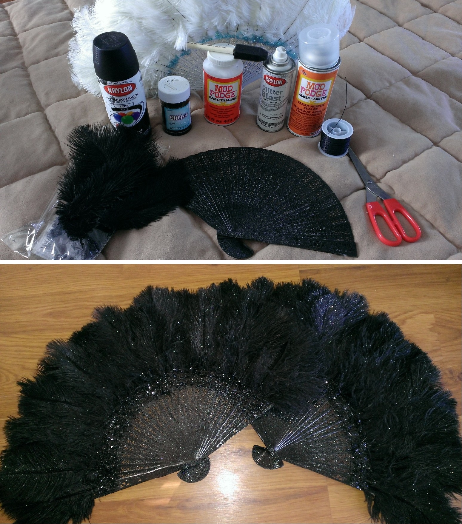 And finally we have the project I have been working: fans for my daughter’s jazz dance group, the top picture being the items used (except for the original fan – a folding, lightweight wood fan) and the bottom being the finished product, well two of the five that were made . My favorite item: the glitter spray paint. It gets glitter everywhere and since I have discovered this amazing product my entire house sparkles. π :